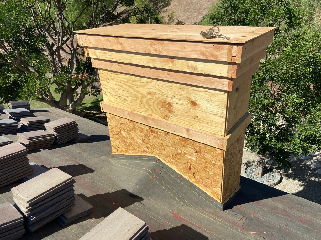 Not only do we do rain gutters but we also fabricate metal. Here is a before and after of a Chimney Saddle & Tile Pan with Top Tile covered by Z Bar before the new roof got installed
